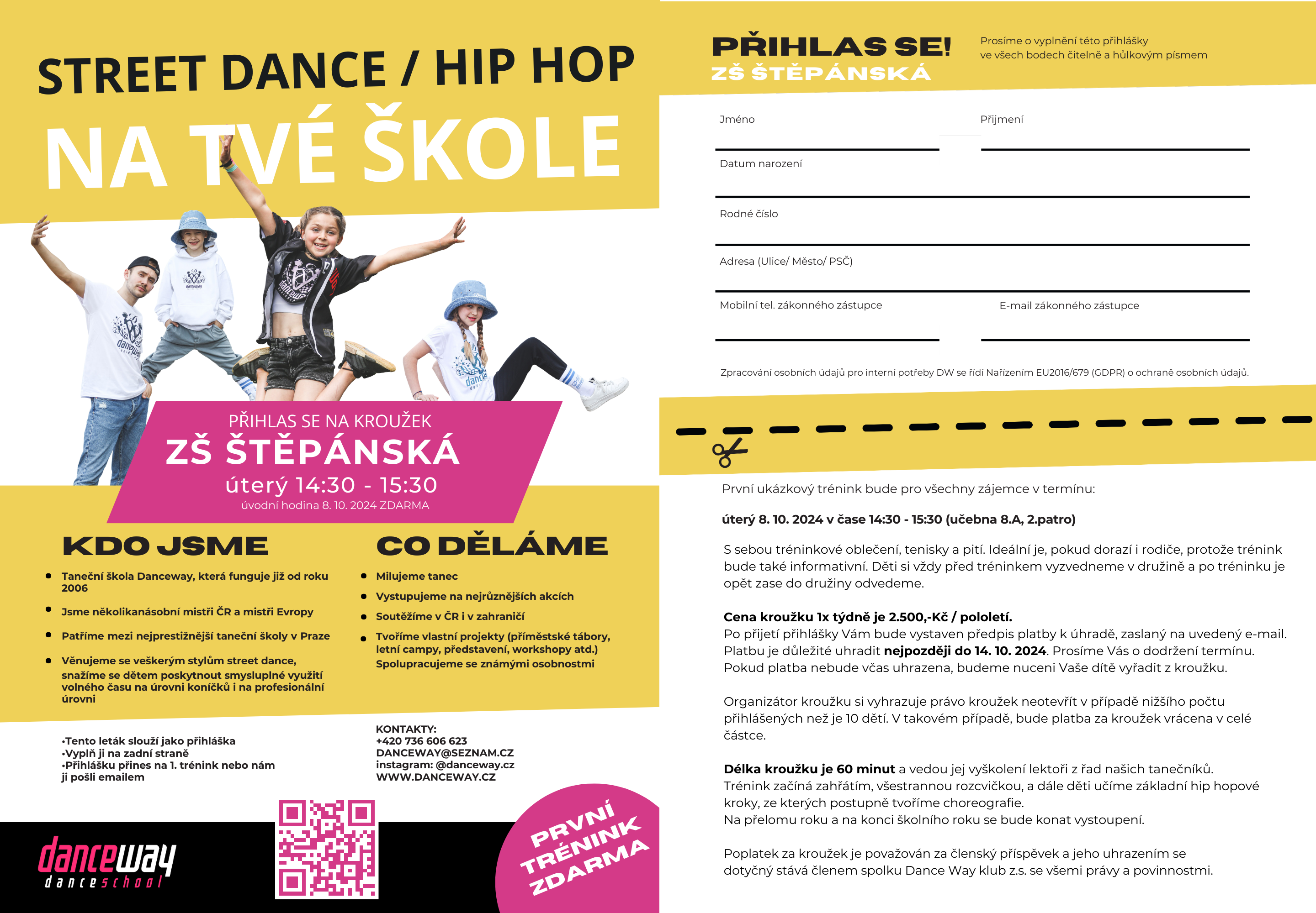 | ZŠ Štěpánská | úterý | 14:30-15:30 | 8. 10. 2024 | 2.500,-/pololetí | učebna 8.A, 2. patro |